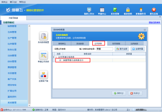軟件中需要啟用下參數(shù),在功能導航窗點擊“系統(tǒng)管理”打開“系統(tǒng)參數(shù)配置”,業(yè)務參數(shù)中啟用參數(shù)“銷售零售價啟用最近價”,并保存參數(shù)配置,如下圖所示: