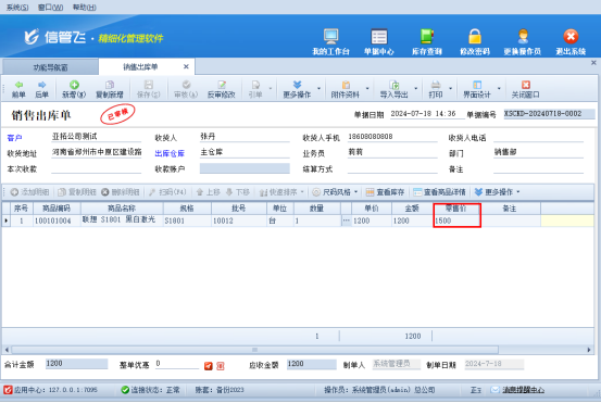 參數(shù)設置完成后,在功能導航窗點擊“銷售管理”—》“銷售出庫單”,新增銷售出庫單,銷售出庫開單界面配置顯示出零售價,客戶“亞拓軟件測試”需銷售商品“聯(lián)想 S1801 黑白激光打印機”,零售價為1500元。如下圖所示:
