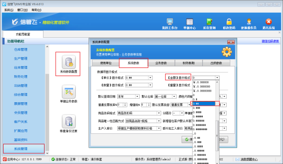 在功能導航窗點擊“系統管理”—》“系統參數配置”—》“系統參數”,在“系統參數”界面可以設置數據項顯示格式,調整金額顯示格式稅額的也會改變,設置完之后點擊“保存”按鈕保存配置,如下圖所示: