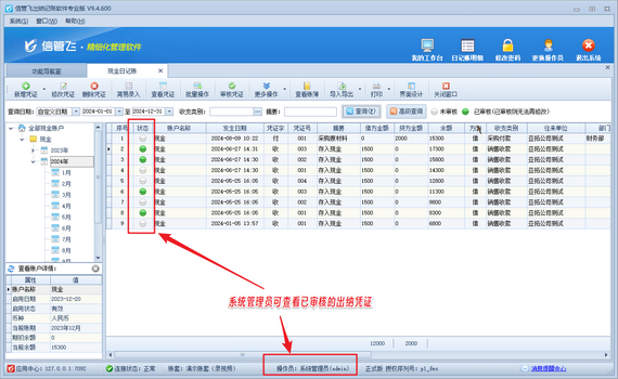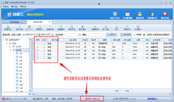 有用戶在使用信管飛出納記賬軟件時,系統(tǒng)管理員賬號登錄軟件可以查看已審核的出納日記賬憑證,但是操作員賬號登錄軟件無法查看已審核的出納日記賬憑證,如下圖所示。