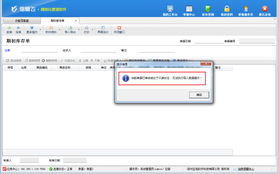 進(jìn)入期初庫存單界面,點(diǎn)擊導(dǎo)入,提示“當(dāng)前單據(jù)已審核或處于只讀狀態(tài),無法執(zhí)行導(dǎo)入數(shù)據(jù)操作!”,如圖: