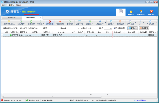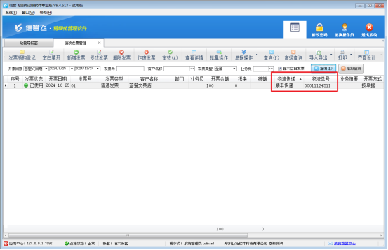 保存后物流快遞和物流單號即可在界面顯示,填寫好后保存發(fā)票,返回銷項(xiàng)發(fā)票管理界面,此時(shí)物流快遞和單號會正常顯示。