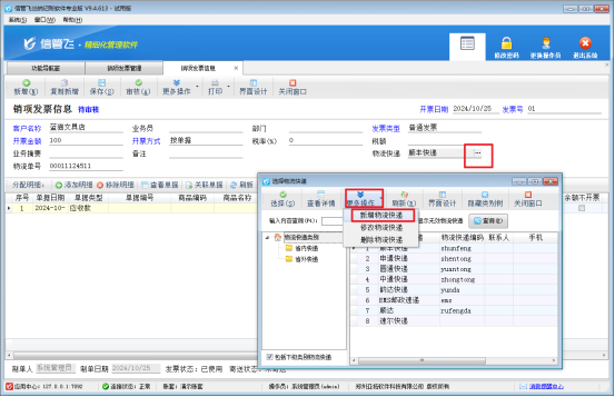在現(xiàn)代企業(yè)的財(cái)務(wù)管理中,出納記賬軟件已經(jīng)成為不可或缺的工具,其中的發(fā)票管理功能可以讓企業(yè)高效快速地管理發(fā)票信息。部分用戶在使用過程中需要顯示出發(fā)票對應(yīng)的物流快遞和單號。本文以“信管飛出納記賬軟件”為例介紹下如何在銷項(xiàng)發(fā)票信息界面正確填寫物流快遞和快遞單號,以確保財(cái)務(wù)信息的準(zhǔn)確性和可追溯性。