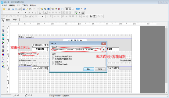 雙擊分組標頭,插入表達式“[FormatDateTime('yyyy-mm',[應收款信息."發(fā)生日期"])]”,設置發(fā)生日期按照年月統(tǒng)計查詢應收金額總計。