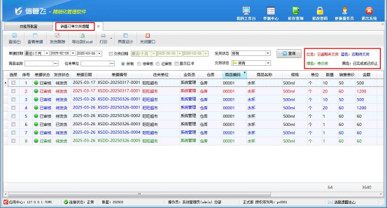 實(shí)時(shí)狀態(tài)追蹤:紅/藍(lán)/綠/黑四色預(yù)警系統(tǒng),清晰區(qū)分超期、近期待交貨、正常待交貨及完成狀態(tài)。