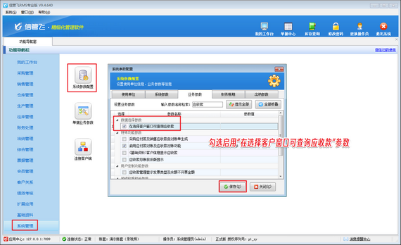 信管飛RMS軟件擁有完善的進(jìn)出庫功能,同時(shí)支持采購銷售出入庫單據(jù)自動(dòng)生成往來應(yīng)收應(yīng)付款功能。值得一提的是,在開出入庫單據(jù)時(shí),它支持顯示當(dāng)前往來單位的欠款情況。系統(tǒng)管理員用戶登錄軟件后只需在功能導(dǎo)航窗依次點(diǎn)擊“系統(tǒng)管理”—“系統(tǒng)參數(shù)配置”,在“業(yè)務(wù)參數(shù)”中勾選“在選擇客戶窗口可查詢應(yīng)收款”這一參數(shù),并保存設(shè)置。這一簡(jiǎn)單的操作,為后續(xù)快速查詢賬款信息奠定了基礎(chǔ)。
