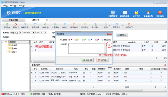 在訂單列表界面雙擊標記備注,點右側(cè)標記可以選擇已維護數(shù)據(jù)字典。