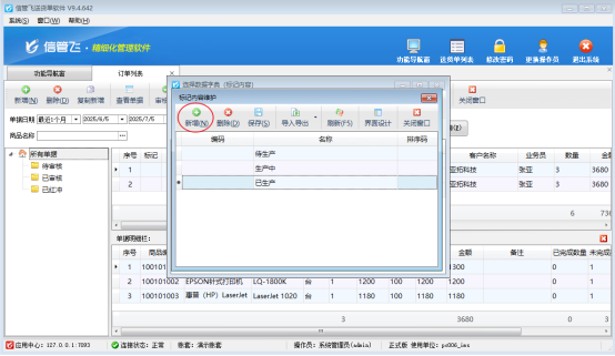 信管飛軟件支持對訂單列表、送貨單列表以及退貨單列表使用不同顏色旗幟標記備注,把標記常用內(nèi)容可提前維護到數(shù)據(jù)字典中,方便標記時候直接選擇錄入,例如訂單列表,可以先把生產(chǎn)狀態(tài)維護在數(shù)據(jù)字典中,標記直接使用。本文示范下如何操作?
