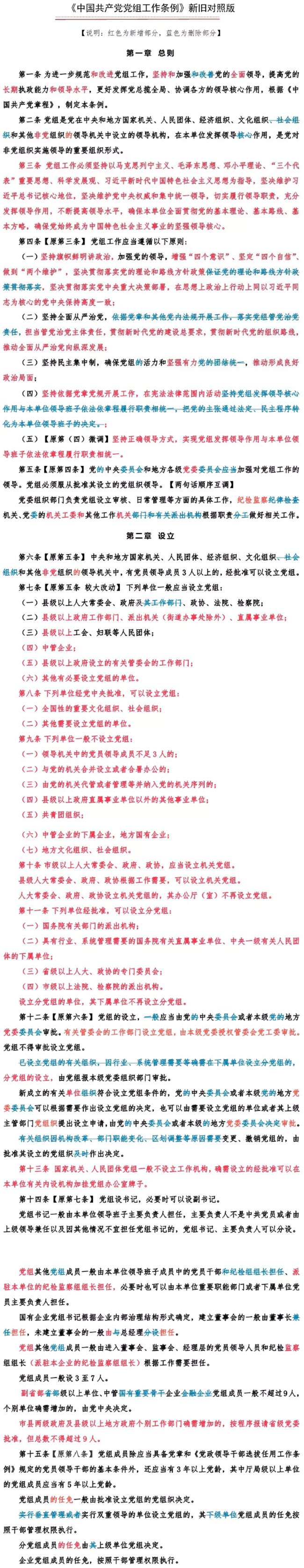 通知指出,2015年6月中共中央印發(fā)的《中國共產(chǎn)黨黨組工作條例(試行)》,對推進(jìn)黨組工作制度化、規(guī)范化、程序化發(fā)揮了重要作用。黨的十九大黨章修正案對黨組職責(zé)作了充實,進(jìn)一步明確了黨組管黨治黨的政治責(zé)任。黨中央根據(jù)新的形勢、任務(wù)和要求,對條例予以修訂完善。