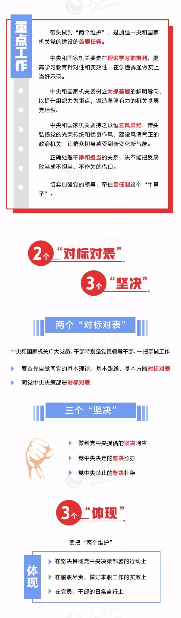 通知要求,各級黨組織要自覺對標習近平總書記重要指示精神,找差距、查問題、補短板,深化檢視剖析工作。中央和國家機關、省級機關和副省級城市機關要重點查找在做到“兩個維護”方面的差距,看是否做到黨中央提倡的堅決響應、黨中央決定的堅決照辦、黨中央禁止的堅決杜絕;查找在加強理論學習方面的差距,看是否在真學真懂真信真用習近平新時代中國特色社會主義思想上下功夫;查找在夯實基層基礎方面的差距,看是否存在機關黨建“燈下黑”的問題;查找在正風肅紀方面的差距,看是否堅決克服形式主義、官僚主義,是否堅持嚴字當頭,加強對黨員、干部全方位的管理監督,一體推進不敢腐、不能腐、不想腐;查找在落實主體責任方面的差距,看是否牽住責任制這個“牛鼻子”,做到明責、履責、盡責。