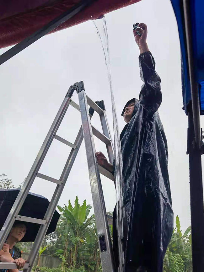 黨員同志冒雨搶修試驗(yàn)現(xiàn)場的工棚