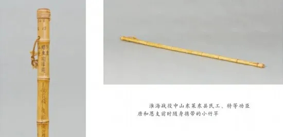 解放戰(zhàn)爭中,人民解放軍的交通運輸條件十分落后,廣大人民用肩挑、車推、驢馱、船運等方法,從千里之外將大量的糧食、彈藥等軍需物資源源不斷地運到前線,將傷病員送往后方醫(yī)治。在中國共產(chǎn)黨歷史展覽館陳列著一件山東農(nóng)民唐和恩千里支前路上使用過的小竹竿,小竹竿長106cm,直徑約為2.5cm,屬國家一級文物,是山東省萊東縣支前民工唐和恩在支前路上支撐走路使用的。支前道路崎嶇,唐和恩走累了就拿小竹竿當拄棍,遇有河流阻擋,就用小竹竿來探深淺,風(fēng)雪淤泥中用小竹竿尋道路。有時候遇到國民黨軍的轟炸,他就在小竹竿上綁上樹枝和茅草偽裝防空;翻山越嶺他就把小竹竿高高舉過頭頂在最前面引路。戰(zhàn)役中,唐和恩幾乎跑遍了整個淮海戰(zhàn)場,每到一地,他就把地名刻在小竹竿上,共刻下了山東、安徽、江蘇3個省88個城鎮(zhèn)和村莊的名稱,行程長達5000余里。一件小小竹竿銘刻了偉大的支前路,也充分顯示了人民戰(zhàn)爭的巨大威力。