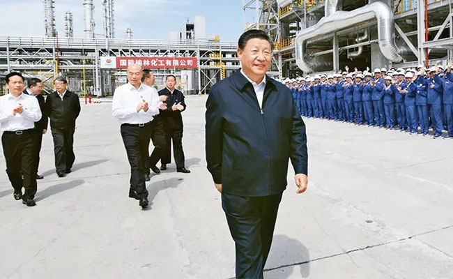2021年9月13日至14日,中共中央總書記、國家主席、中央軍委主席習近平在陜西省榆林市考察。這是13日上午,習近平在國家能源集團榆林化工有限公司年產40萬噸乙二醇項目現場考察。 新華社記者 李學仁/攝