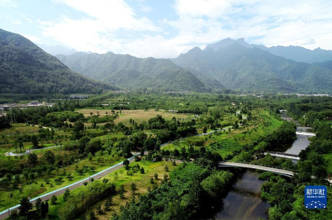 這是2019年7月26日拍攝的陜西省西安市長安區秦嶺違建別墅拆除后建設的秦嶺和諧森林公園(無人機照片)。新華社記者 劉瀟 攝