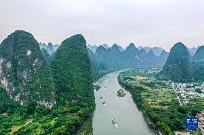 這是2021年4月25日拍攝的漓江廣西陽朔段(無人機照片)。新華社記者 曹祎銘 攝