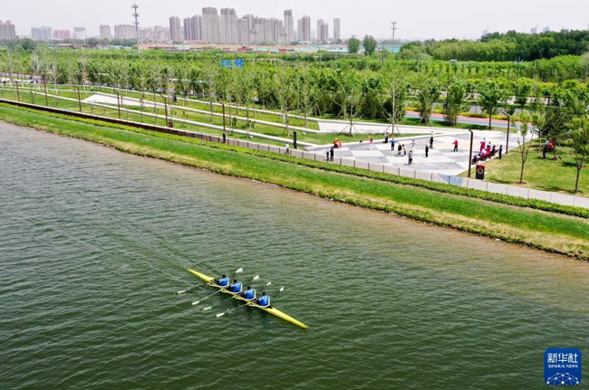 山西皮劃艇隊隊員在汾河太原城區晉陽橋段水面上訓練(2020年5月12日攝,無人機照片)。新華社記者 曹陽 攝
