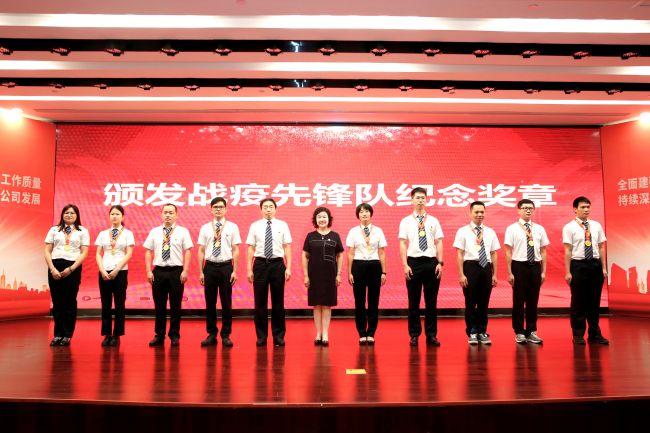 今年4月,廣州突發疫情,在集團黨委堅強領導下,廣電計量聞令而動,3月共派三批次共122名黨員支援基層疫情防控服務共418天,4月共派兩批次共58名黨團員、職工群眾支援白云區疫情防控服務共691天,為打贏疫情阻擊戰貢獻廣電計量力量。為進一步激勵黨員干部、團員青年和職工群眾守初心擔使命,大會觀看白云區戰“疫”回顧短片并向戰疫先鋒隊員頒發戰疫先鋒隊紀念獎章。
